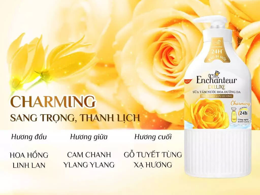 Hương nước hoa Charming huyền thoại: Mùi hương Charming mang đậm phong cách cổ điển, sang trọng chuẩn Pháp, giúp bạn tỏa hương thơm ngát suốt nhiều giờ liền.