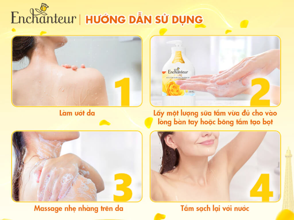 Để các tinh chất trong sữa tắm Enchanteur Deluxe Charming 650g thẩm thấu tốt nhất, khách yêu của Huyền Anh hãy thực hiện theo các bước: